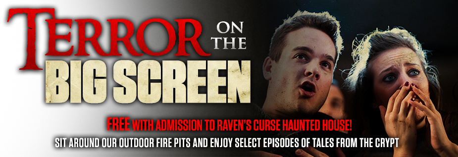 Take a seat around one of our outdoor fire pits, enjoy a snack or glass of hot chocolate from our gift shop and enjoy select horror films. Terror on the Big Screen is a great place to pump yourself up before going into Raven’s Curse Haunted House or to relax and let your heartbeat settle once you’ve made it through. Terror on the Big Screen is FREE with your admission to any of our attractions and is open every night Raven’s Curse Haunted House is operating if weather permits.